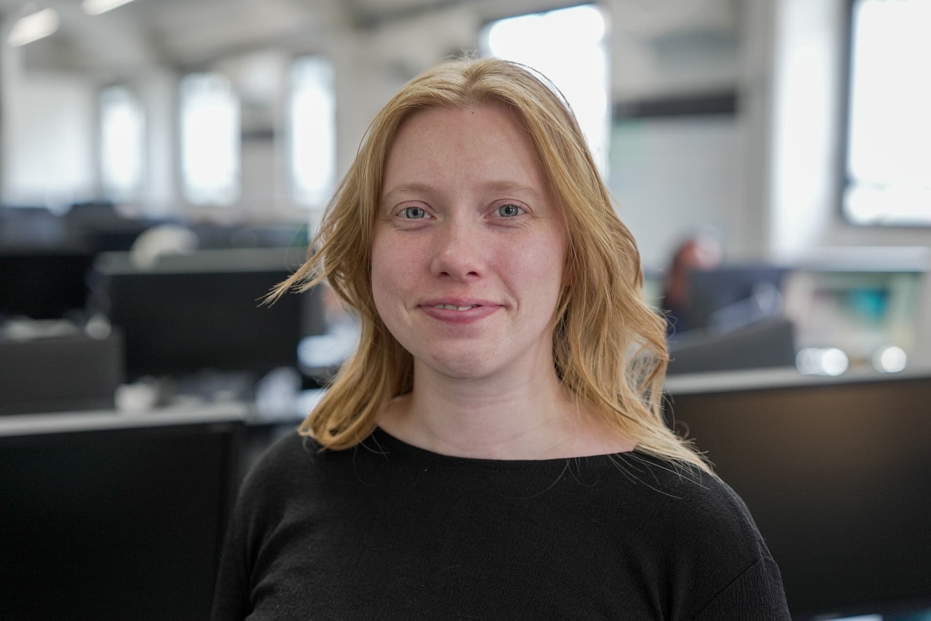 Portrait of a young woman with long dark hair wearing a colorful geometric blouse, standing in a bright open-office setting and looking at the camera.
