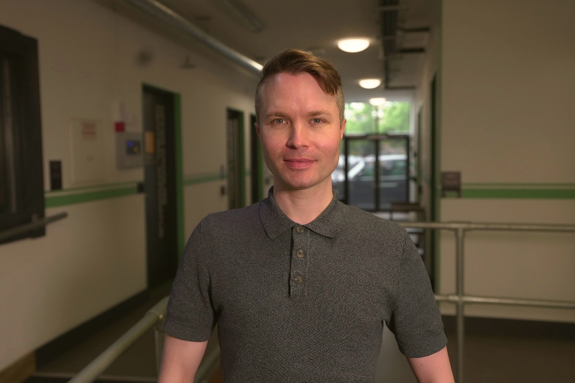 Portrait of a man in a gray polo shirt standing in a hallway with green accents, looking at the camera.